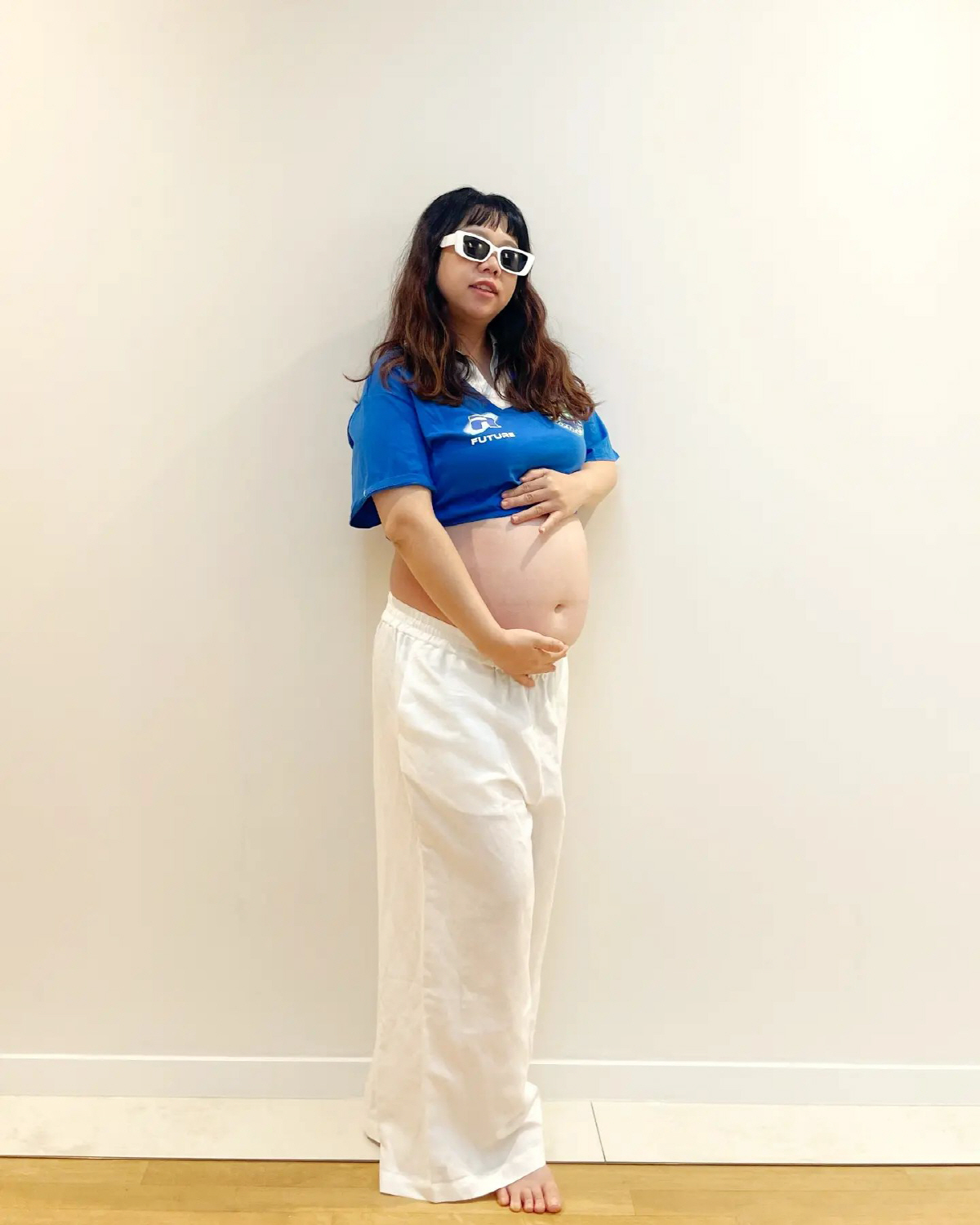 사진 속 홍현희는 파란색 티셔츠와 하이트 팬츠를 입었다. 특히 셔츠를 올려 만삭인 배를 노출했다. 흰색테의 선글라스도 눈길을 끌었다.