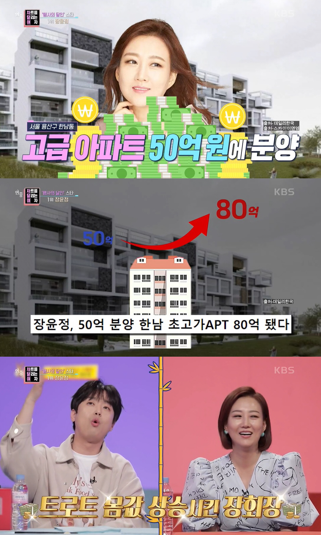 장윤정은 그렇게 모은 수입으로 지난해 3월 한남동에 위치한 고급 아파트를 50억 원에 분양받았는데, 두 달 만에 30억 원이 올라 화제를 모으기도 했다.