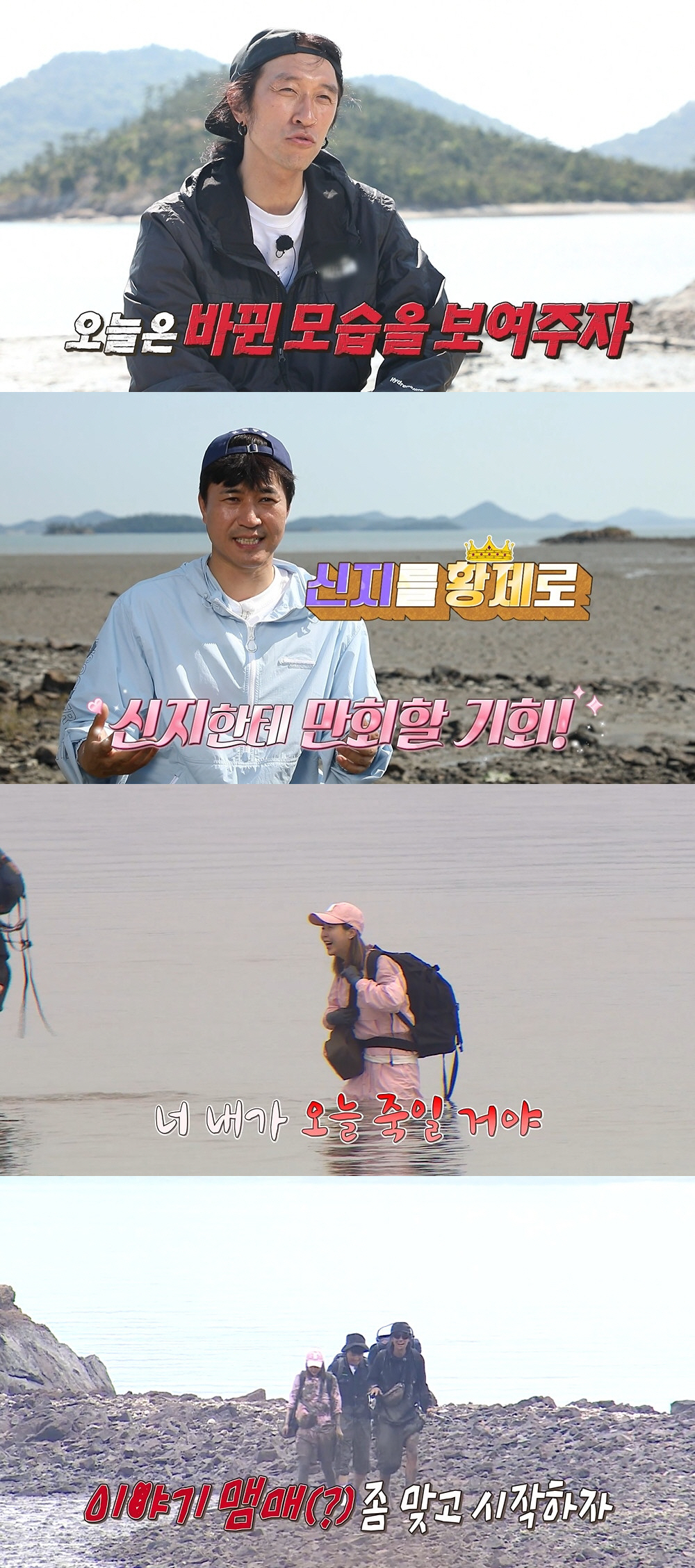 결국 세 사람은 갯벌을 통해 섬 입성에 나선다. 눈치를 보던 김종민과 빽가는 신지를 위해 인간 가마로 변신하지만, 신지를 들기는커녕 제 몸도 못 가누는 모습으로 명불허전 '덤 앤 더머' 형제의 컴백을 알린다.