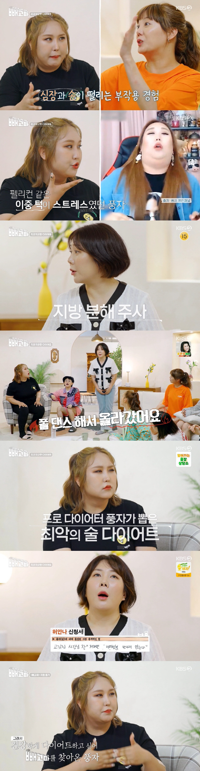 한편 허안나는 다이어트 목적에 대해 "MZ세대 옷이 입고 싶다"고 밝혔다. 특히 언더붑, 로라이즈 패션에 도전하고 싶다는 그는 "근데 살 빼면 가슴도 없어져서 고민"이라고 말했다. 풍자는 "많이 배우고 가고 싶다. 한때 32kg 뺐을 때 살 빠졌으니까 노출 있는 촬영을 하자고 했는데 요요 현상이 와서 촬영이 취소가 됐다"며 "건강해지고 싶다. 건강하게 일하고 싶다"고 밝혔다.