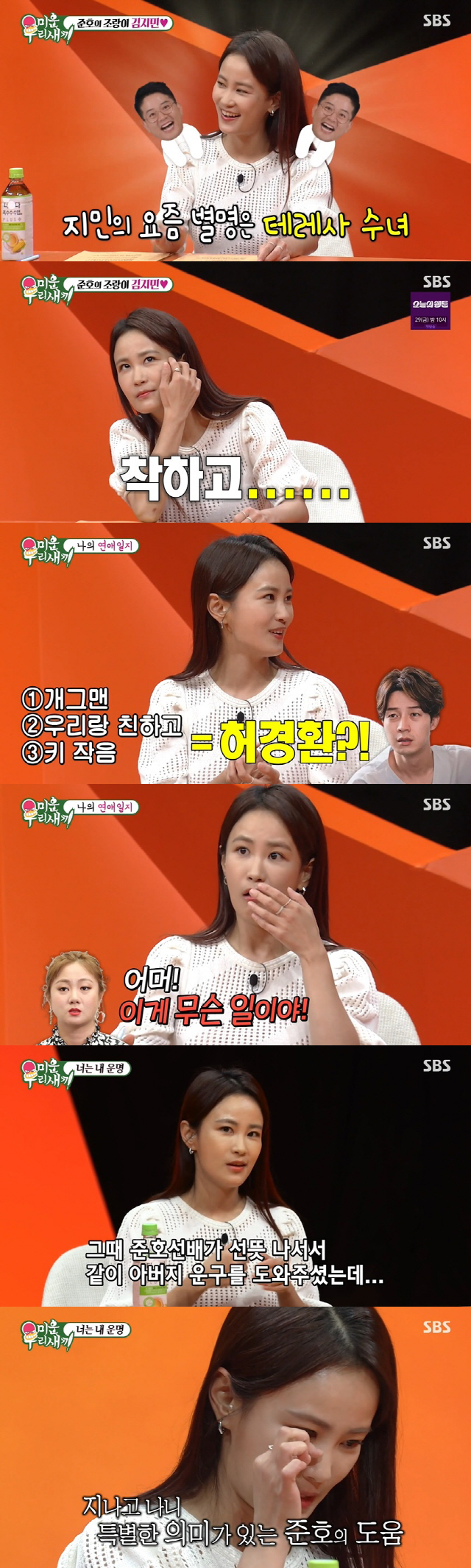 김지민은 '사랑의 오작교'였던 박나래에게 연애 사실을 밝혔을 당시 일화도 공개했다. 박나래와 친한 개그우먼 2명이 함께 있을 때 남자친구에 대한 힌트를 주고 사라졌다는 김지민은 "만나는 남자가 있다고 하면서 개그맨이고, 너네랑 되게 친하고, 키가 작고, 정말 웃기다고 말해주고 사라졌다. 그때 셋이서 술 마시면서 누군지 추리하다가 결론이 허경환으로 났다더라"고 말해 웃음을 자아냈다. 이어 "바로 알려주기 싫어서 박나래에게 '남친 데리고 너네 집 갈 거야'라고 했다. 그때 내가 먼저 들어가고 '자기야 들어와'라고 했고, 김준호가 온 걸 보고 박나래가 '이게 무슨 일이야' 하면서 계속 안 믿었다"라며 "'이건 아니지'라고 하다가도 응원하고 그랬다"고 전했다.