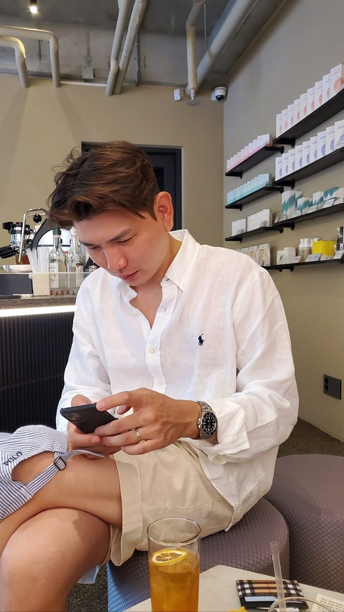 공개된 사진 속 제이쓴은 카페에서 음료를 마시며 핸드폰을 하고 있는 모습. 흰 셔츠에 베이지색 반바지를 입은 제이쓴은 훈훈한 비주얼을 자랑해 시선을 모은다.
