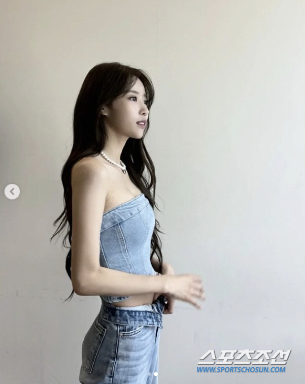 공개된 사진 속 이미주가 데님 튜브톱에 청바지를 입고 '청청패션'에 도전했다.