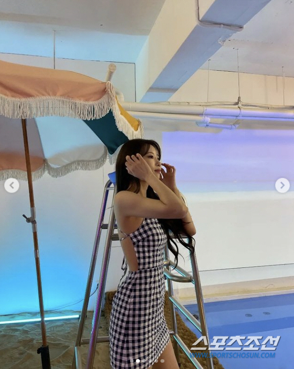 이미주는 요즘 유행하는 스타일을 따라, 바지 후크를 풀어 배꼽을 살짝 드러냈다. 섹시 콘셉트지만, 뽈록하게 한 뺨과 쭈욱 내민 입술이 귀엽다.