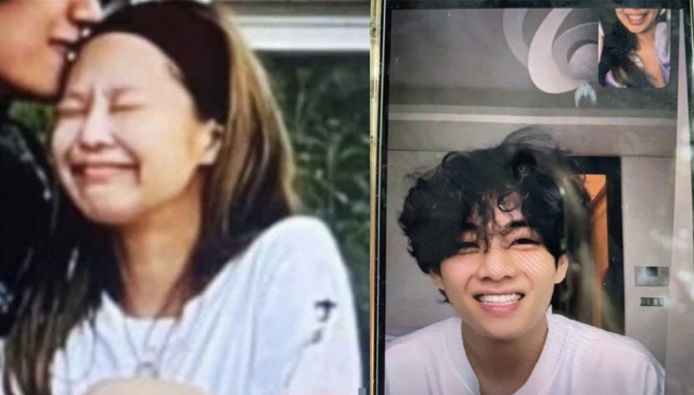 이날 공개된 사진은 뷔로 추정되는 남성이 제니의 이마에 입맞춤을 하고, 뷔가 환하게 웃으며 한 여성과 영상통화를 하고 있는 모습이다. 다만, 두 사진 모두 상대방의 얼굴 절반이 가려져 확인되지 않는다.