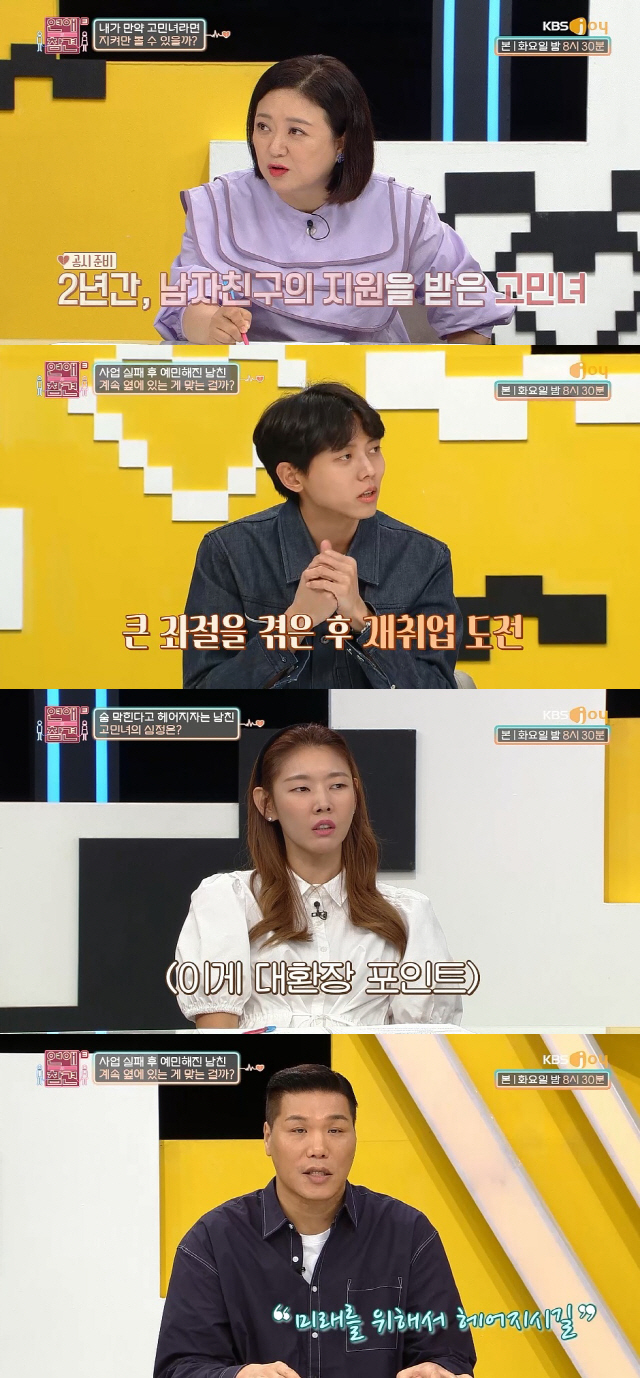 그렇게 남자친구는 세 달 째 좌절의 늪에서 빠져나오지 못했다. 고민녀는 자신에게 늘 힘이 되어주던 남자친구가 무너지는 것을 보며 안타까워하면서도 매일 누워있는 남자친구에게 지쳤다. 김숙은 "좌절해서 누운 사람과 희망 품고 공부하는 사람을 지원해주는 건 완전히 다르다. 누워 있는 사람 시중 드는 건 못 할 것 같다"며 안타까워했다.