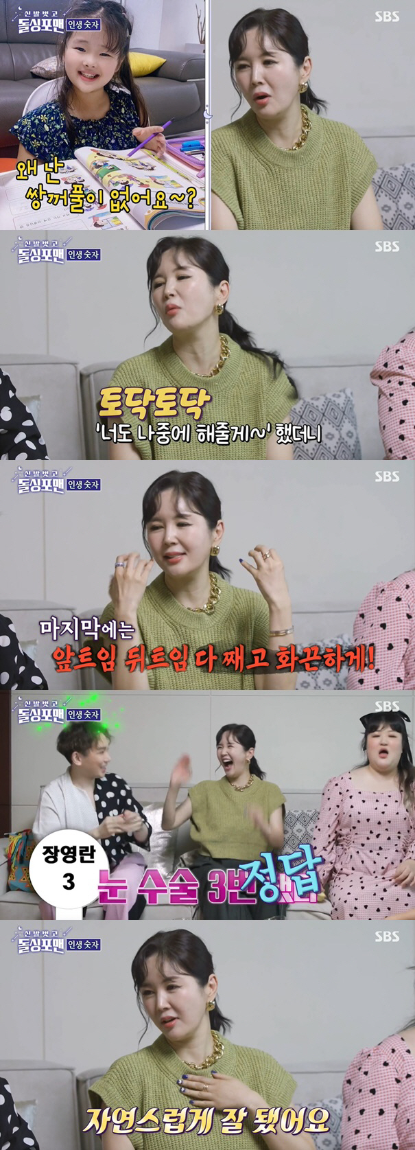이어 장영란은 쌍꺼풀이 없다며 "딸이 왜 자기는 쌍꺼풀 없냐고 하더라. 그래서 너도 나중에 수술 시켜주겠다고 했더니 안심하더라"고 솔직하게 말해 눈길을 끌었다.