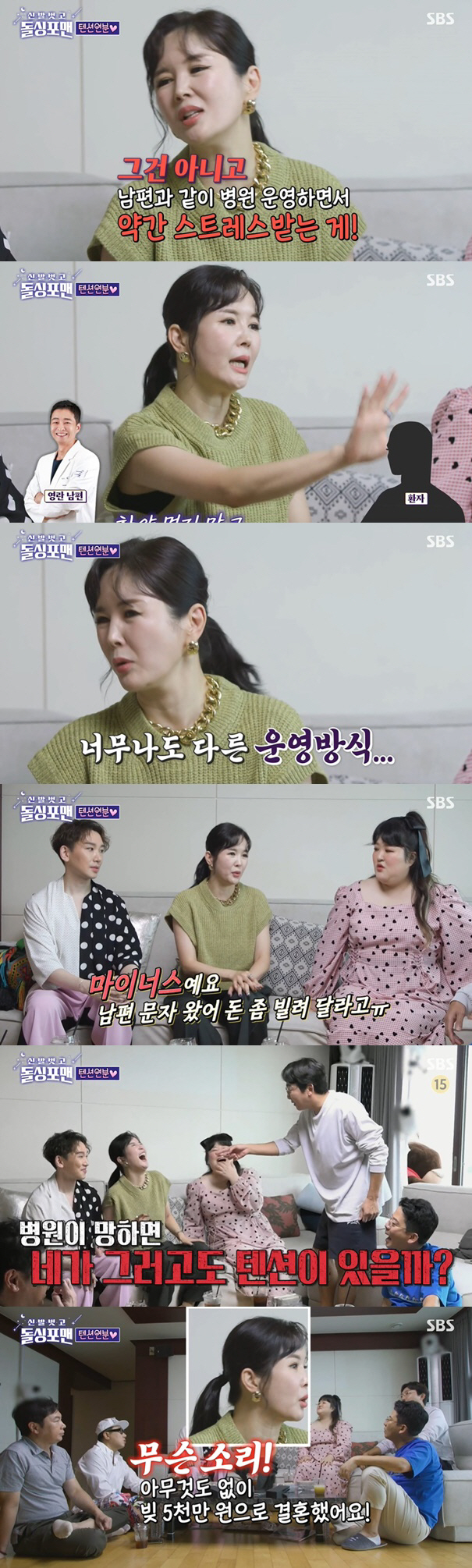 이를 들은 탁재훈은 걸렸다는 듯 "네가 남편 병원이 망했는데도 웃을 수 있을 것 같냐"라며 몰아붙여 폭소를 안겼다. 또한 "남편 돈 보고 결혼한거냐"고 질문했지만 장영란은 "아니다. 아무 것도 없이 빚 5천만원으로 결혼했다"고 답했다.