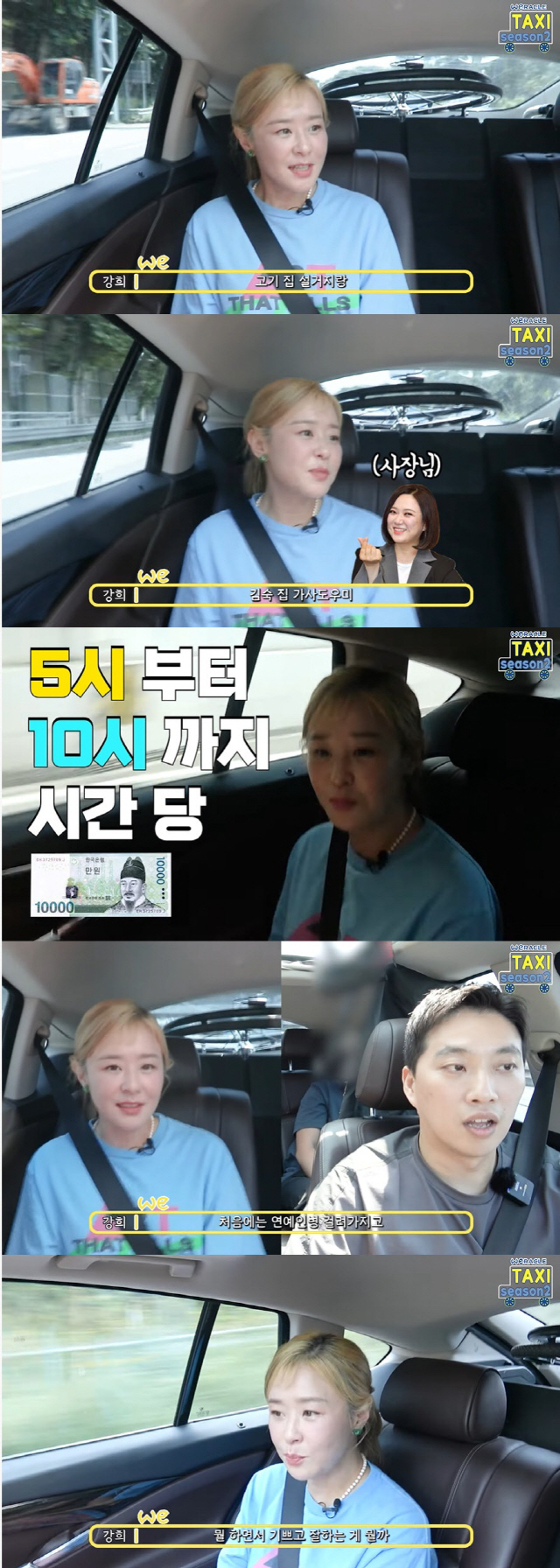 최강희는 근황에 대해 "고깃집 설거지와 김숙 집 가사도우미로 아르바이트하고 있다. 3개월 됐다"고 밝혀 놀라움을 자아냈다. 최강희는 "5시부터 10시까지 시간당 만 원"이라며 "처음에는 연예인병 걸려서 (주방에서) 안 나왔는데 20대 애들이 날 모른다"며 웃었다.