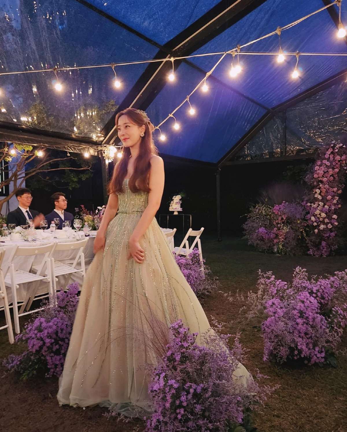 공개된 사진에는 결혼식 애프터 파티 중인 고우리의 모습이 담겼다. 이날 연두색 계열의 드레스를 착용한 그는 마치 디즈니 공주같은 모습으로 시선을 사로잡았다.