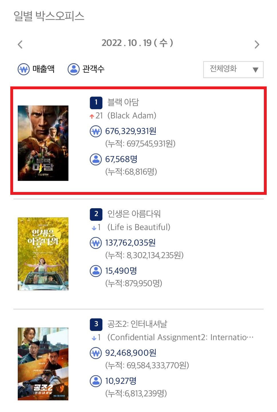 영화관입장권 통합전산망에 따르면 '블랙 아담'은 개봉 첫날 19일 6만7568명의 관객을 동원하며 전체 박스오피스 1위를 기록했다. 이는 뜨거운 입소문으로 흥행 역주행에 성공한 '인생은 아름다워'와 장기 흥행 중인 '공조 2: 인터내셔날', 그리고 평단의 극찬으로 화제를 모은 '에브리씽 에브리웨어 올 앳 원스' 등 쟁쟁한 경쟁작들을 제치고 압도적인 스코어로 1위를 차지해 새로운 흥행 강자의 탄생을 알렸다.