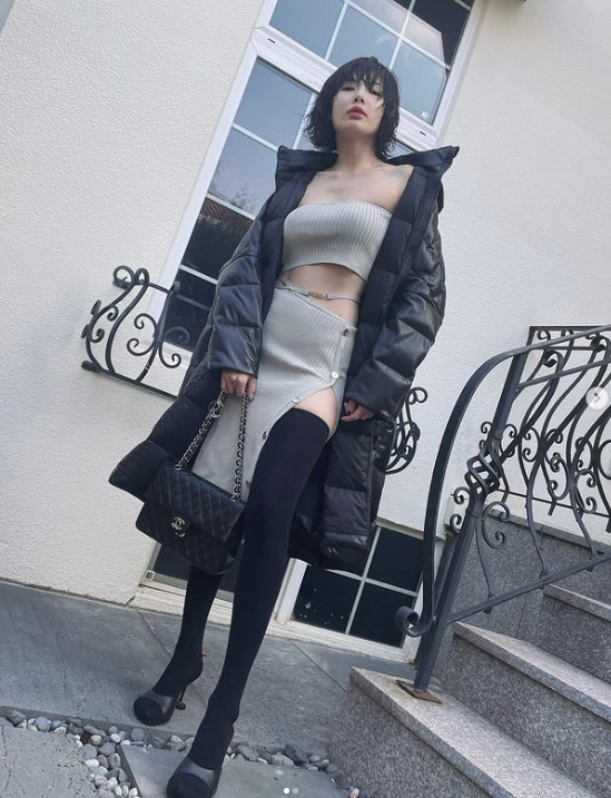 현아는 최근 하트 이모티콘과 함께 여러 장의 사진을 게재했다. 공개된 사진 속에는 패딩에 명품백을 매치한 패션을 선보인 현아가 담겼다. 패딩 안에는 오프숄더 니트 원피스를 입은 현아. 현아는 허벅지, 배 부분을 시원하게 드러냈다.