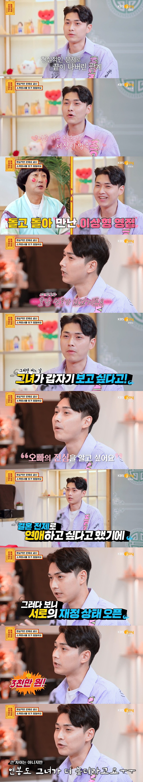 어느날 밤 그녀의 보고싶다는 말 한마디에 바로 집 앞으로 달려갔다는 의뢰인은 "'너는 왜 나랑 안 사귀냐'고 물어봤더니 '오빠가 고백을 안했잖아요'라고 하더라. 그러면서 가볍게 만나는 건 싫다며 결혼에 대해 진지한 이야기를 바랐다"며 "결혼 가치관에 대해서 대화를 나눴다. 현실적인 부분도 얘기를 나눴고 결국 재정 상태를 오픈하게 됐다. 그녀가 어느 정도 돈을 모아뒀냐고 물어보더라. 솔직하게 3천만원 정도 모았다고 말했고, 부모님께 도움은 못 받는다고도 알렸다. 그런데 그녀는 저축한 돈에 부모님 지원까지 받을 수 있다고 하더라. 또 서로 연봉도 공개했는데 그분이 저보다 높더라"고 전했다.