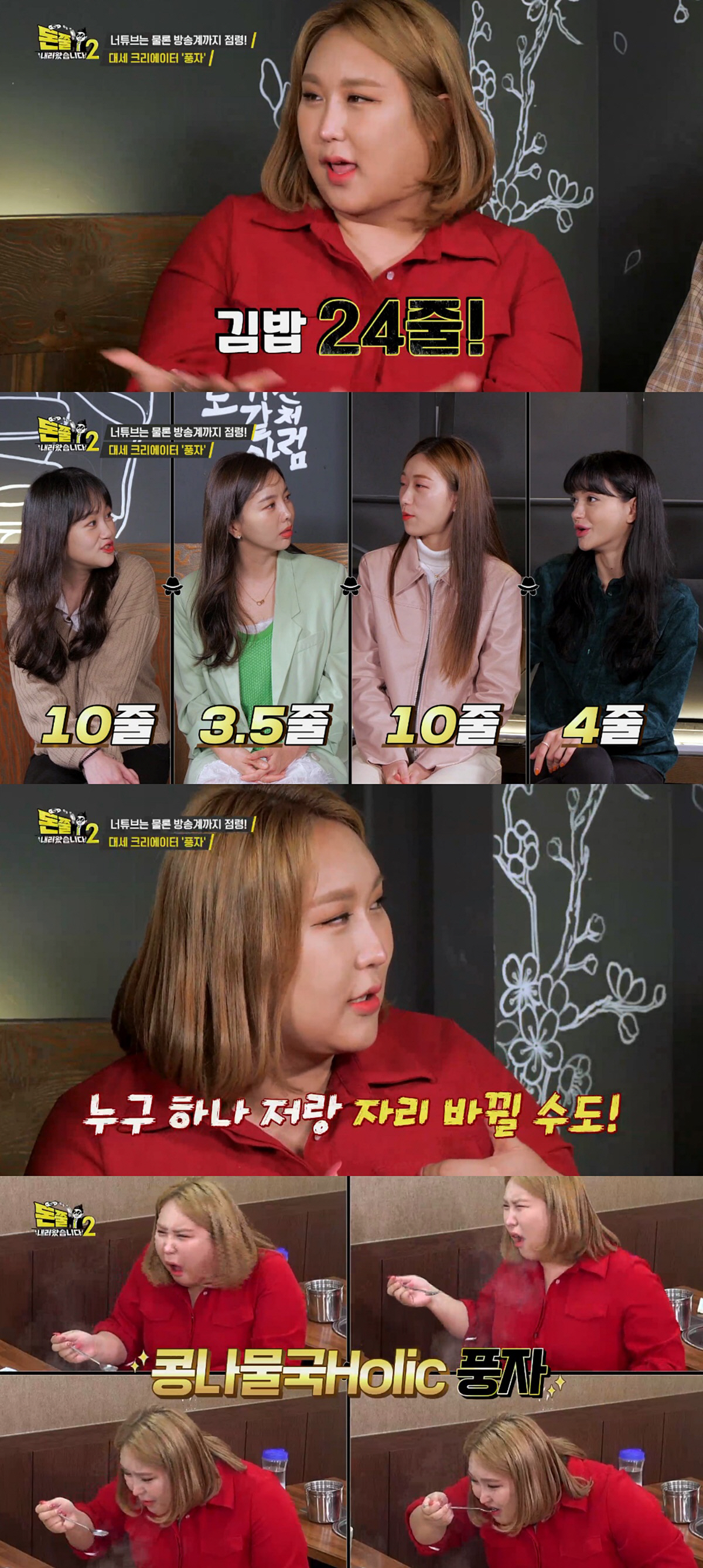 곧이어 스페셜 먹요원으로 크리에이터 풍자가 등장, "한창때 김밥 24줄을 먹었다"라고 말해 모두를 놀라게 만든다. '먹보스' 이영자가 보증하는 먹요원들조차 "24줄은 무리다"라며 혀를 내두르기 때문.