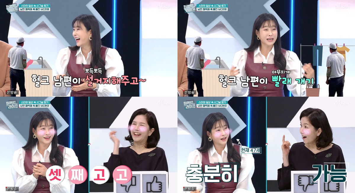그러자 현영은 "남편이 10년 되더니 좀 바뀌었다. 원래 남편은 몸이 헐크 같고, 무뚝뚝한 상남자 스타일이다. 근데 요즘 호르몬 때문에 그런지 헐크가 설거지해주고 헐크가 빨래를 개고 있다"고 자랑했다. 그러면서 "육아랑 살림을 너무 잘 도와줘서 예뻐 죽겠다"고 애정을 과시했다.