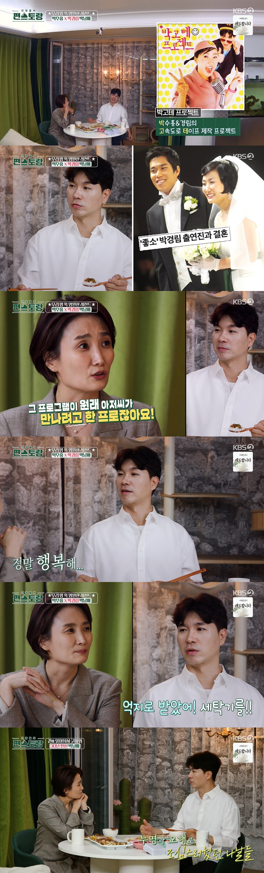 또 박경림은 박수홍과 함께 진행하던 프로그램에서 남편을 만나 결혼하게 된 일을 언급하며 "그 프로그램이 원래는 아저씨가 만나려고 한 거 아니냐. 지금은 천생연분을 만났지만, 그때는 아저씨가 '경림아 내가 좋은 사람 만나보려는데 같이 프로그램하자'고 했다"고 말했다. 아내를 의식한 박수홍은 "넌 너무 방송 잘하지만 편집할 이야기를 왜 이렇게 길게 하냐. 그만해라"라고 울컥해 폭소케 했다.