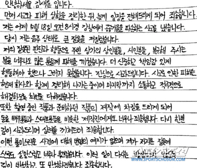 당시 김새론은 "잘못된 판단과 행동으로 주변 상가 상인, 시민, 복구해준 분들 등 너무나도 많은 분들께 피해를 끼쳤다. 불미스러운 사건에 변명의 여지가 없다. 내가 저지른 잘못에 스스로도 실망스럽고 너무나 부끄럽다"며 "이런 일이 다시는 발생하지 않도록 깊이 반성하고 또 반성하겠다. 죄송하다"고 자필의 사과문의 공식 개인계정에 올린 바 있다.