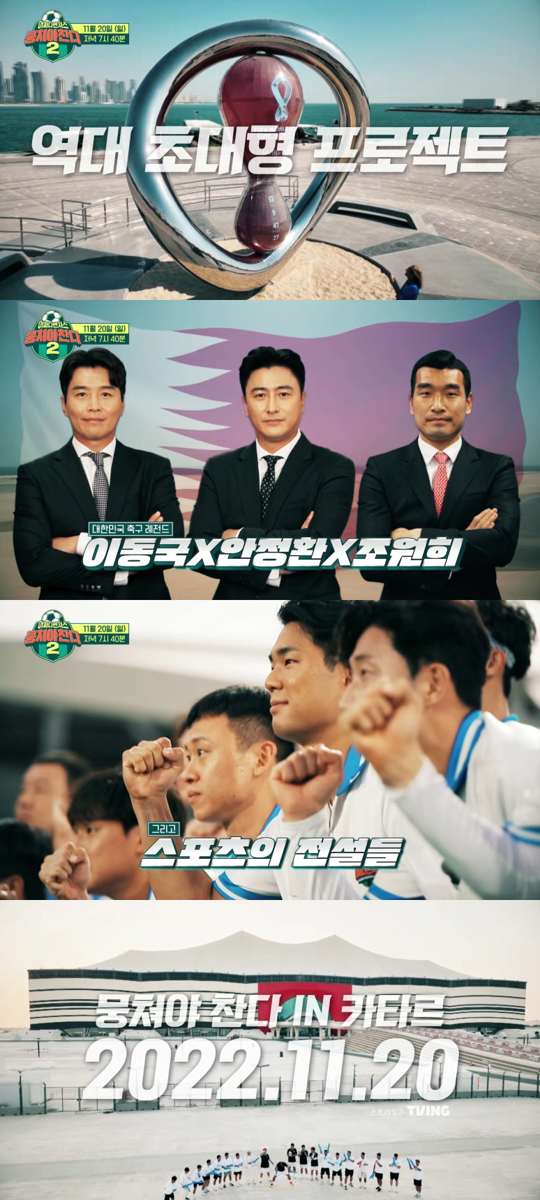 특히 최고의 조합으로 예능 프로그램 최초 카타르에 도착한 이들은 개막전이 펼쳐질 알 바이트 스타디움 앞에서 대한민국 국가대표 팀의 선전을 기원하며 힘찬 응원을 보내 보는 이들의 심장을 뜨겁게 달군다.