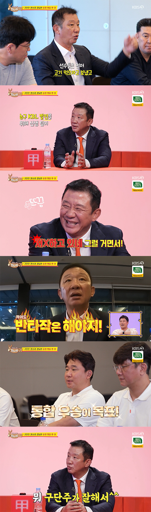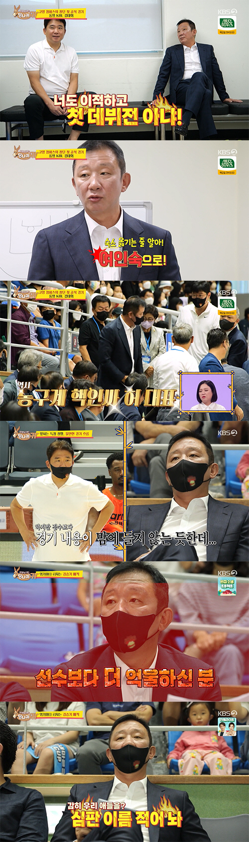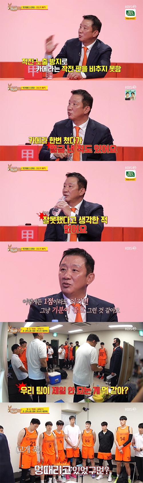 김승기 감독의 다급한 작전 타임 영상을 지켜보던 허재는 "과거 중계 카메라를 쳐서 벌금 낸 적이 있다. 카메라가 작전판을 비춰서 카메라를 쳤고, 벌금을 냈다"는 열혈 감독 시절 일화를 밝혀 출연진들을 깜짝 놀라게 만들었다.