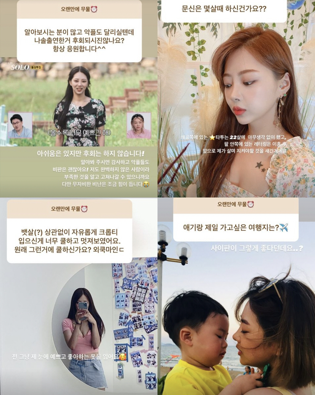 [스포츠조선 고재완 기자] ENAPLAY X SBS PLUS '나는 SOLO'(나는 솔로) 10기 옥순이 자신의 개인 계정에 '무물보'(무엇이든 물어보세요)를 진행하며 일상을 털어놨다.
