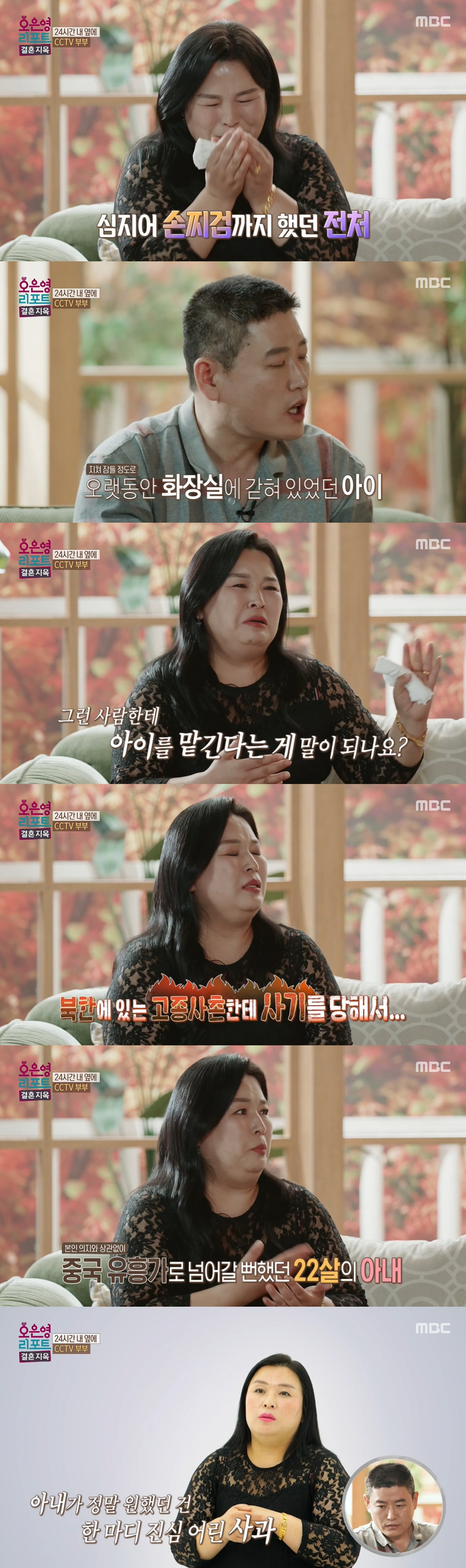 아내는 북한에 있는 고종사촌한테 사기를 당해서 중국으로 왔고, 당시 중국 유흥가로 넘어갈 뻔했다고. 고종사촌은 인신매매를 통해 생활비를 벌려고 했던 것. 아내는 "필사적인 저항 끝에 탈출했다"면서 "지금 부모님 곁에 있었으면 이렇게 살지 않았을텐데. 가족들 있는 게 너무 부럽다"면서 눈물을 쏟았다.