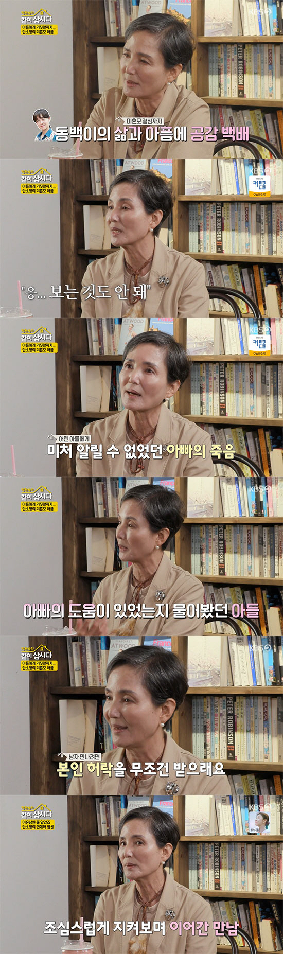 안소영은 "내가 계산적으로 생각하지 못하다 보니까 순수한 마음밖에 없었다"면서 "아들이 '그러니까 엄마가 사는게 힘든거야'라고 하면서 '엄마가 혹시 남자가 생기게 되면 나한테(아들) 데리고 와서 허락을 받아'라고 하더라"고 덧붙였다.