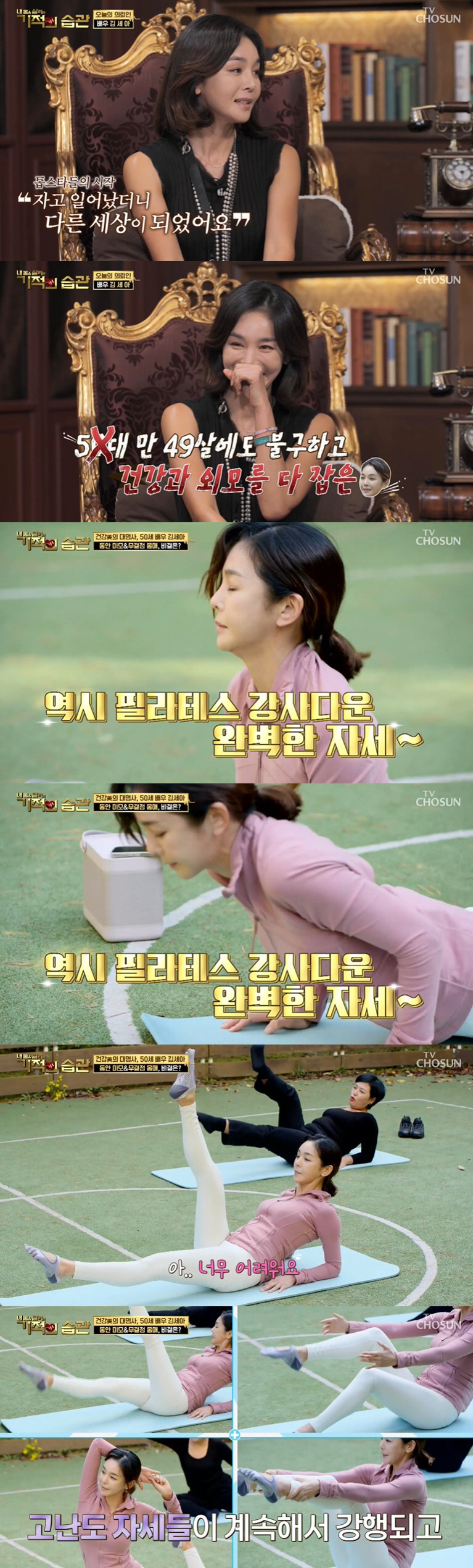 13살, 12살 아이를 두고 있는 김세아의 나이는 50. 김세아는 놀라운 동안 비결을 공개했다. 어릴 적부터 리듬체조로 몸매를 가꾼 김세아는 필라테스 국제 자격증까지 갖고 있었다. 김세아의 집 곳곳에는 이를 증명하듯 운동 기구들이 가득했다. 김세아는 평상시에도 운동을 하려 한다며 스쿼트 자세, 책을 허벅지 사이에 끼우는 '책벅지 자세'를 하기도 했다.