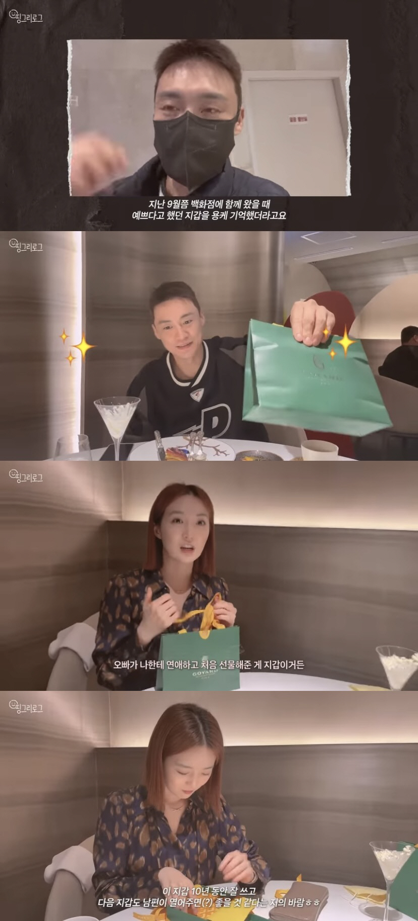 이어 "(오빠가) 10년에 한 번씩 지갑을 사주면 어떨까 생각했다. 고마워 10년 동안 돈 많이 벌게"라고 고마움을 표했다. 이를 들은 오상진은 "3개월 할부로 구매했다"며 너스레를 떨어 웃음을 줬다.