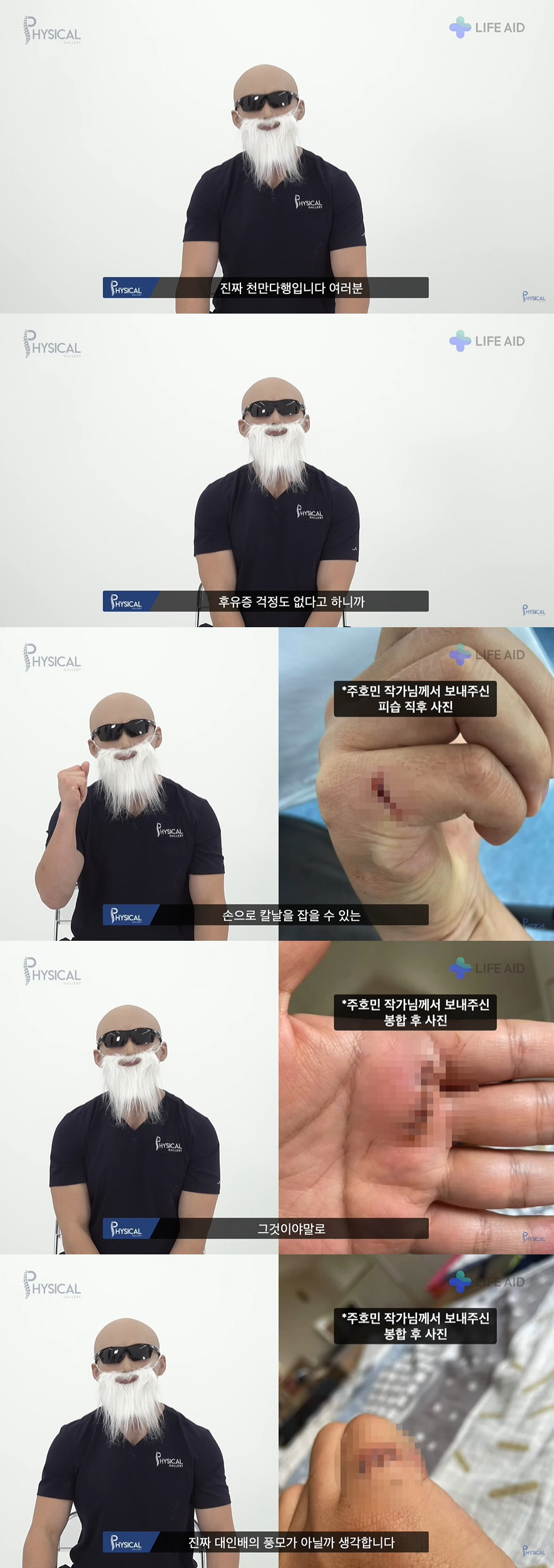 김계란은 다친 후 상처 관리를 언급하며 "어쩔 수 없는 상황이라면 손으로 칼날을 잡아서라도 목숨을 건지는 게 굉장히 중요하다"고 밝혔다. 이어 김계란은 주호민의 손 상처를 함께 보여줬다. 피습 직후 주호민은 손바닥과 손등에 꽤 깊은 상처를 입었다. 김계란은 "손의 영구손상 위험에도 불구하고 손으로 칼날을 잡을 수 있는 그 판단과 용기 그것이야말로 주호민 작가님의 진짜 대인배의 풍모가 아닐까 생각한다"고 주호민을 치켜세웠다.