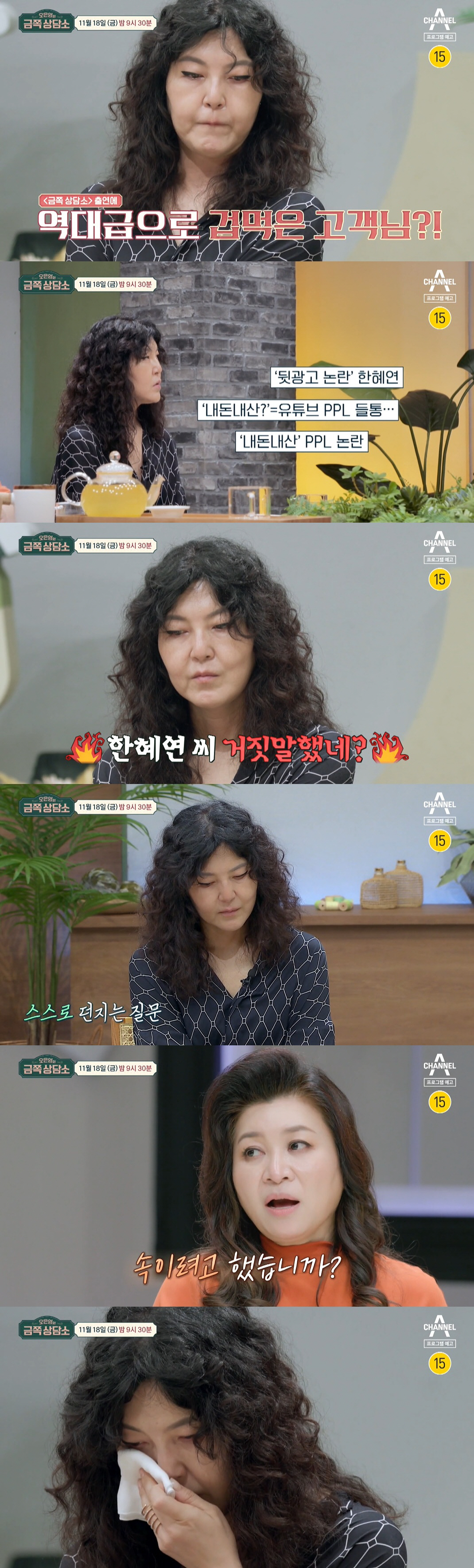 한혜연은 "'금쪽상담소' 출연에 역대급으로 겁먹은 고객님"이라는 정형돈의 소개에 고개를 들지 못했다. 이에 오은영은 2년 전 논란을 빚은 '뒷광고'에 대해 언급했고, 한혜연은 "'내돈내산'으로 해서 방송을 여러 번 했다"고 고백했다.