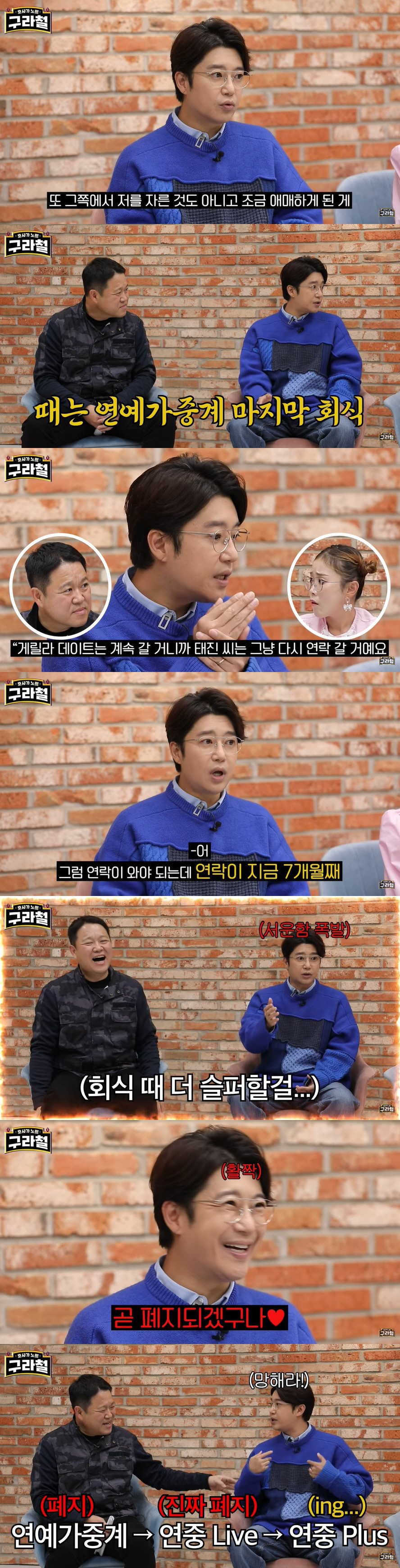 김태진은 "'연예가중계' 이별이라고 슬프게 회식을 했다. 근데 제작진이 저한테 '게릴라데이트는 계속 갈 거니까 태진 씨는 다시 연락 갈 거예요. 그러니까 분위기 맞춰서 같이 슬퍼해달라'더라. 속으로는 미안해하면서도 같이 슬퍼했다. 그럼 연락이 와야 되는데 연락이 7개월째 안 오고 있다. 나는 장기근속자인데 나한테 연락을 해서 '미안하게 됐다'라든지, 누가 내 얘기하면 흐지부지 피한다더라"라고 억울해했다.
