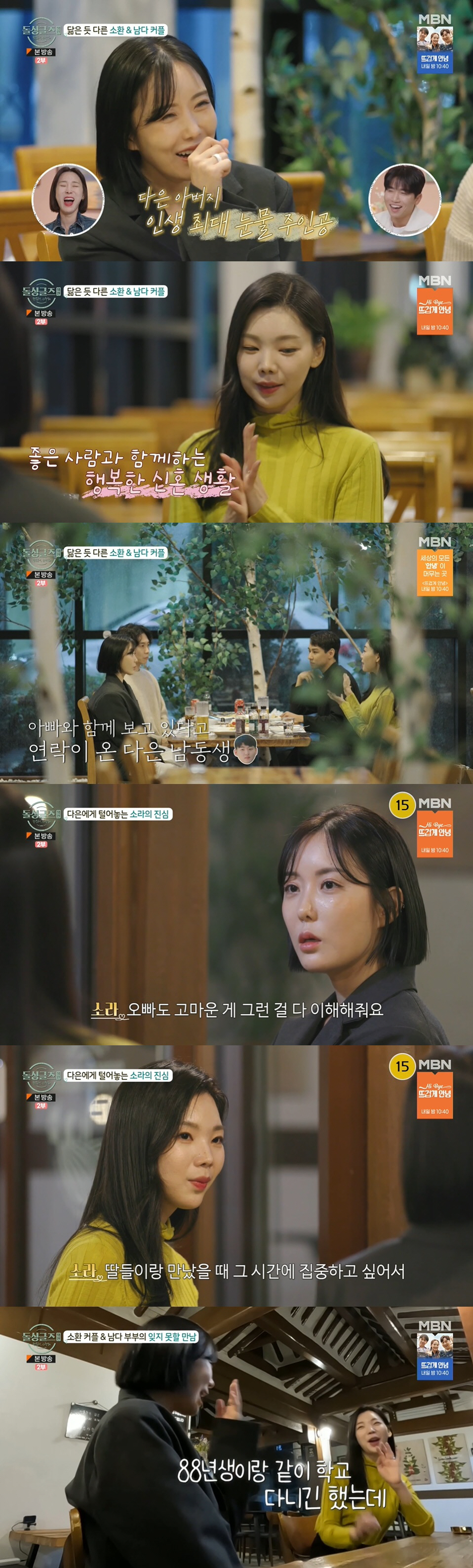 이소라와 최동환은 '돌싱글즈2' 이다은, 윤남기 부부를 만났다. 이다은은 "소라 씨가 어머니와 통화하는 장면을 보고 엄청 울었다. 아빠도 그 장면을 보고 많이 우셨다"고 말했다. 이어 근황을 묻는 질문에 "저희는 1월부터 같이 살고 있다. 좋은 사람을 만나니 행복하다"며 활짝 웃었다. 이소라는 "저희는 넘어야 될 부분들이 있지만 감정에 충실해 만나다가 그때 돼서 생각해 보자고 했다"고 말했다.