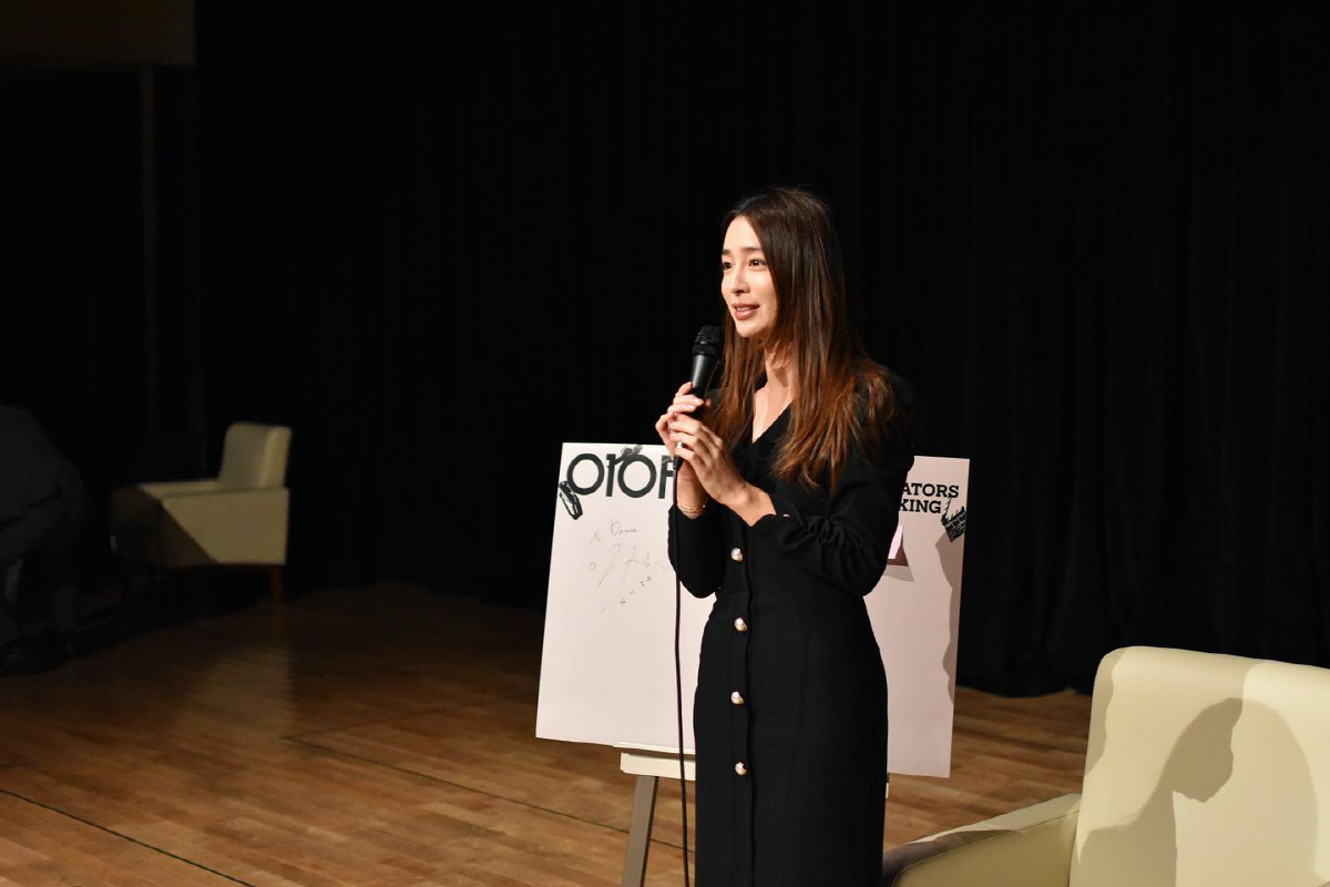 후배들 앞에 선 이민정은 긴장한 듯 두 손으로 마이크를 꼭 쥐고 있는 모습. 블랙 원피스를 입고 단아한 자태를 뽐내는 이민정의 우아한 미모가 감탄을 불러일으킨다.
