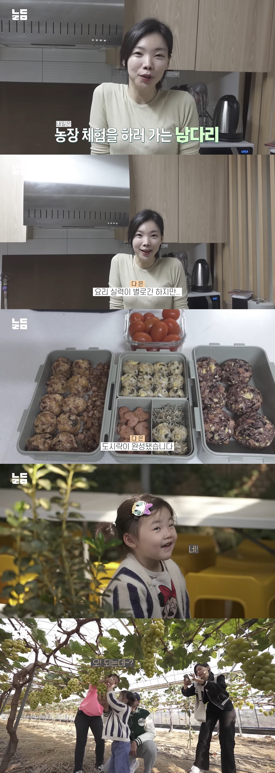 영상 속 이다은은 딸 리은이와 농장 체험 가기 전날, "요리 실력이 별로긴 하지만"이라면서 도시락을 준비했다. 메뉴는 스팸 주먹밥, 김치참치주먹밥. 완성된 도시락에 윤남기는 "너무 잘 만들었다"며 감탄했다.
