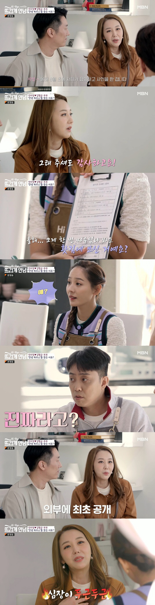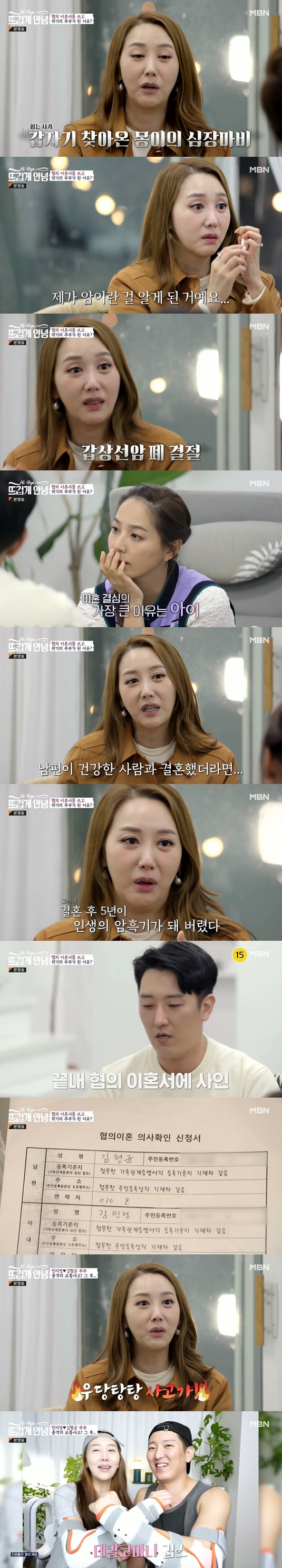 이후 이들 앞에 남편 김형균과 등장한 민지영은 "(협의이혼서를) 대신 제출해 주셔도 감사하다"며 협의이혼 신청서에 대해 "올해 8월 초에 저희가 합의하고 사인을 한거다. 이혼 서류에 사인을 하고 외부에 공개하는건 처음이다. 심장이 두근두근거린다"고 털어놨다.