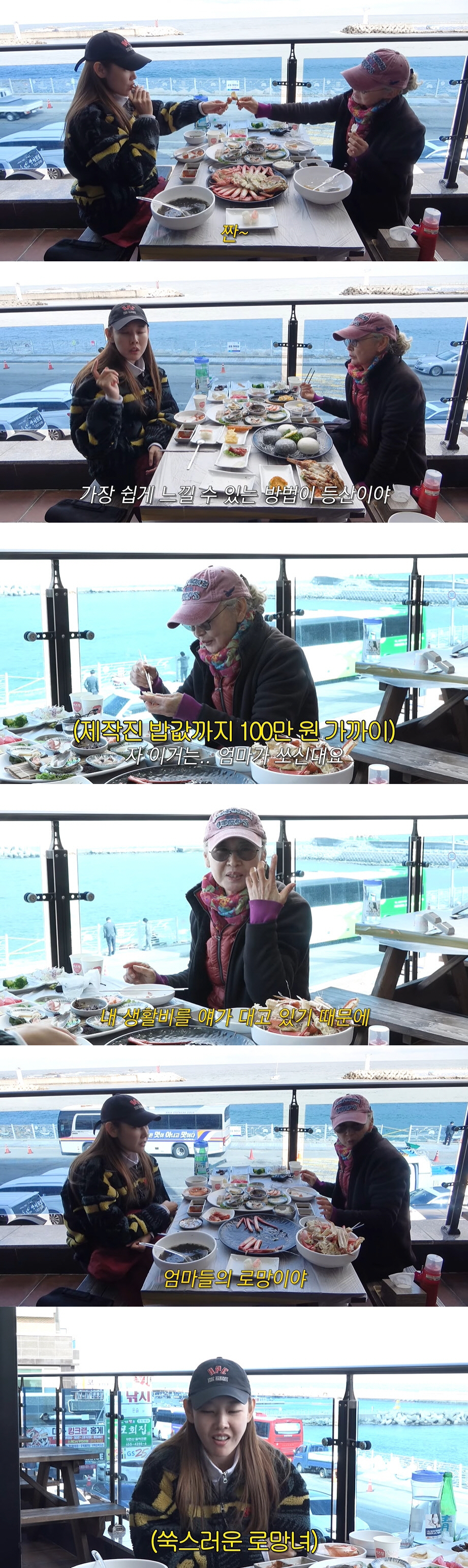 그때 한혜진은 "이거는 엄마가 쏘신대요"라고 하자 제작진은 화들짝 놀랐다. 제작진 밥값까지 100만원 가까이 나왔던 것. 이에 어머니는 "내 카드가 딸 카드나 똑같다"면서 "내 생활비를 딸이 대고 있다. 엄마들의 로망이다. 딸이 카드 주는 걸 제일 좋아한다"며 웃었다. 이후 모녀는 소화시킬 겸 산책을 하며 효도 관광을 마무리했다.