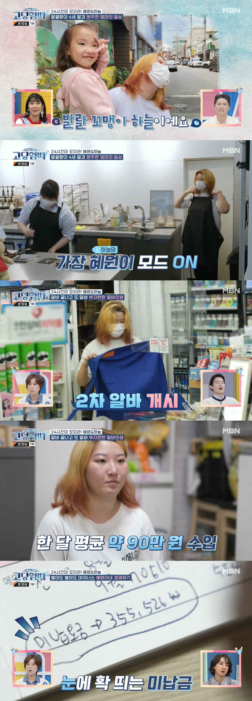 딸 하늘이를 등원시킨 조혜원은 바로 카페 알바, 편의점 알바를 하며 생활비를 벌고 있었지만, 세 식구 생활비로는 빠듯한 돈. 현재 카페, 편의점 알바로 86만원, 지원금 130만원까지 총 수입 220만원 가량으로 생활 중이었다. 가계부 작성 중 눈에 띄는 미납금. 아버지가 동생과 사는 조건으로 금전적 도움을 약속했지만, 초반 한 두번 도움을 준 뒤 '네가 혜빈이도 책임져라'라고 했다고. 알바를 해서 조금이라도 도움을 주고 싶은 동생. 그저 안타깝기만한 상황이었다.