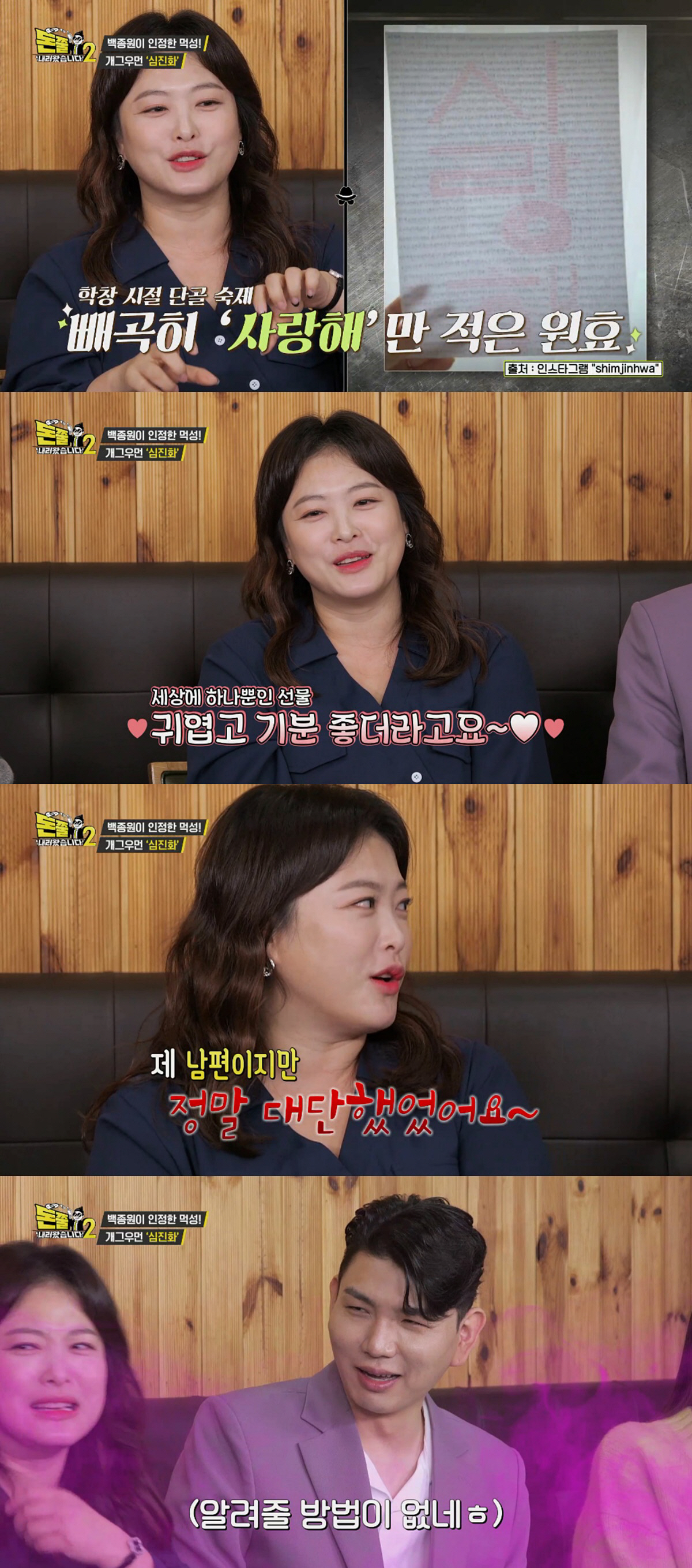 개그맨 김원효와 12년 차 부부인 심진화는 "요즘도 이벤트를 많이 해주나?"라는 질문에 "올해 생일에 엄청 귀여운 선물을 받았다. 깜지에 '사랑해'를 적어왔더라. 생각보다 귀엽고 기분이 좋았다"라고 답해 부러움을 산다.