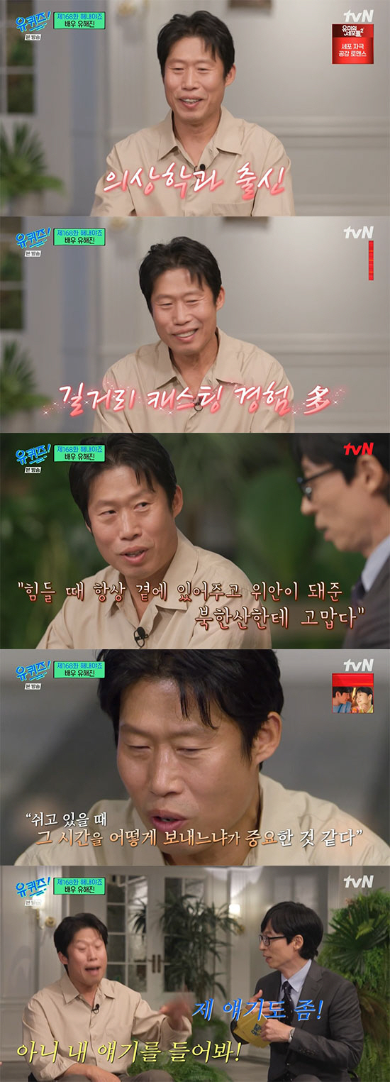 하지만 그런 그도 서울예대 연극과에 두 번 떨어지고 타 대학교 의상과에 진학했다. 이후 27살에 서울예대에 입학한 유해진은 '올A'를 받아 신구 장학금을 받았다. 졸업 후 배우 류승룡과 '동란' 극단생활을 했다는 유해진은 '아르바이트 길거리 캐스팅' 에피소드를 밝혀 웃음을 안겼다. "한 번은 빵을 사러 갔는데 코트를 입은 신사 분이 비데 공장 아르바이트를 제안했다. 친구를 데려오라고 해서 류승룡과 비데 조립을 하면서 이야기를 많이 나눴다"라며 "그런 일이 많았다. 한 번은 오토바이 면허 있냐고 묻더니 혹시 배달해볼 생각 없나고 하더라"고 이야기했고, 이에 조세호는 "길거리 캐스팅을 당하셨다"고 맞장구쳐 웃음을 더했다.