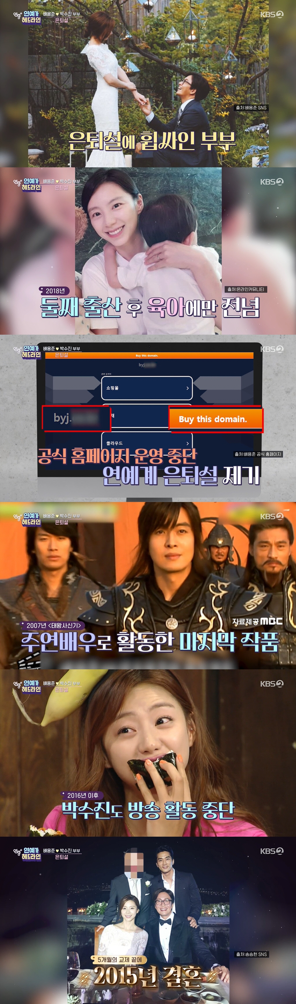 배용준 박수진 부부는 소속사 대표와 소속 배우로 만나 연인으로 발전, 5개월의 교제 끝에 지난 2015년 결혼했다. 이후 2016년 첫째, 2018년 둘째 출산 이후 육아에만 전념하고 있다.
