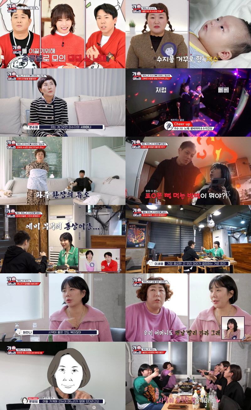 먼저 '애교 만점 개며느리' 이수지는 출산 소식을 알리며 모두의 축하를 받았다. 귀여운 아들 지수와 선한 인상이 돋보이는 남편까지 결혼 생활을 최초로 공개한 이수지는 똑 닮은 입담의 친정 어머니가 육아를 도와주고 있었다. 특히 구례에서 25년 간 농사를 지으며 살고 있는 이수지의 시어머니는 파업을 선언하며 힐링을 위해 서울로 올라왔고, 서울에 도착하자 마자 아들에게 "수지공주는 어딨냐"며 특별한 며느리 사랑을 보였다.