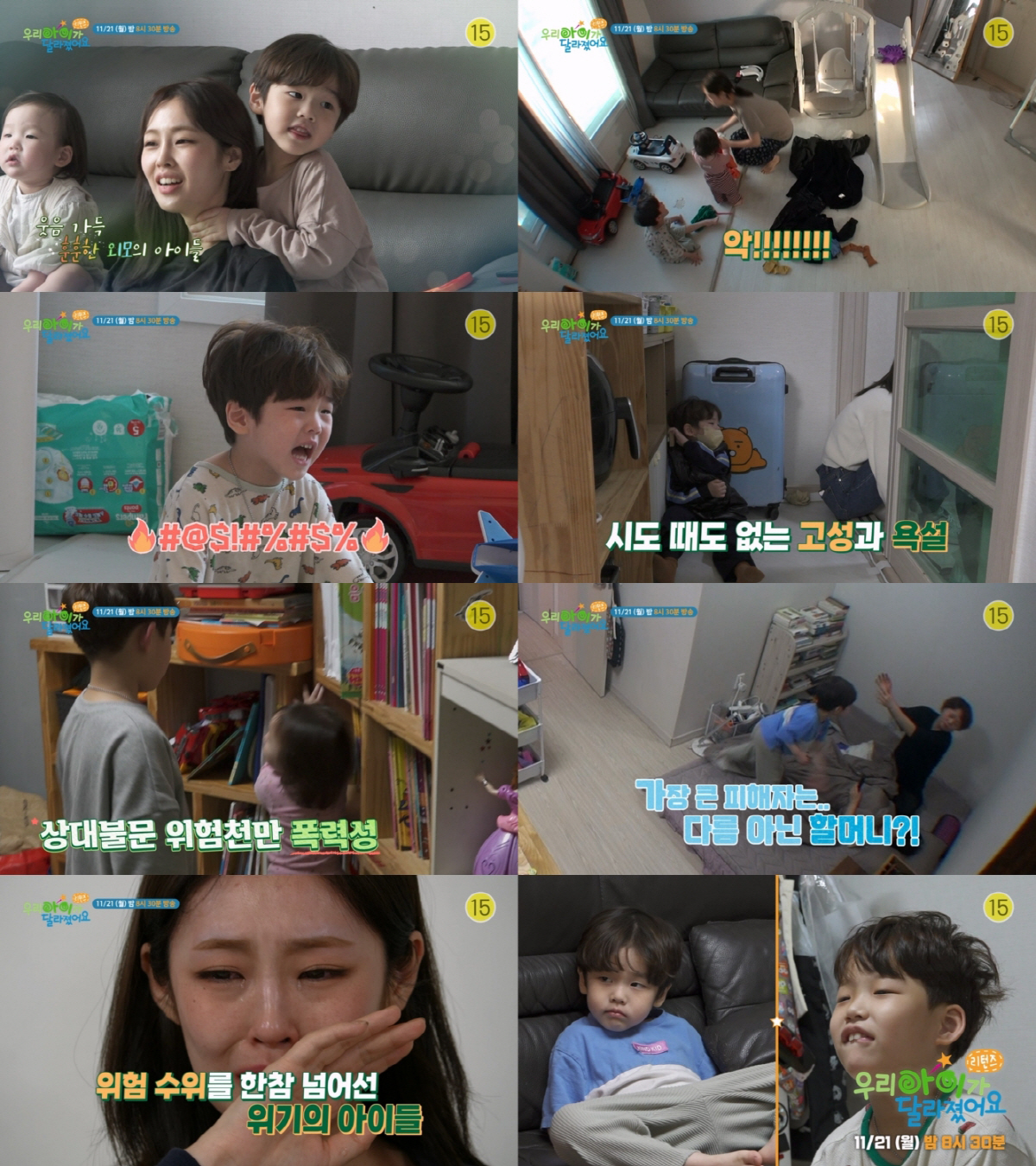 그러나 분위기는 한순간에 반전됐고, 귀여운 아이들의 외모 속에 숨겨진 문제행동이 드러났다. 한 아이는 비명을 넘어 거친 욕설을 마구잡이로 뱉었다. 뿐만 아니라 두 형제는 막냇동생의 머리를 때리기도 하고, 서로를 향해 발길질을 날려 위험천만한 순간들이 발생했다. 할머니가 애써 두 형제를 말려봐도, 두 아이는 물건을 집어던지고, 얼굴을 발로 차며 폭력을 휘둘렀다. 위험수위를 넘어선 두 아이의 문제행동에 아이들의 엄마가 눈물을 멈추지 못하며 힘겨워하고 있는 모습도 포착됐다.