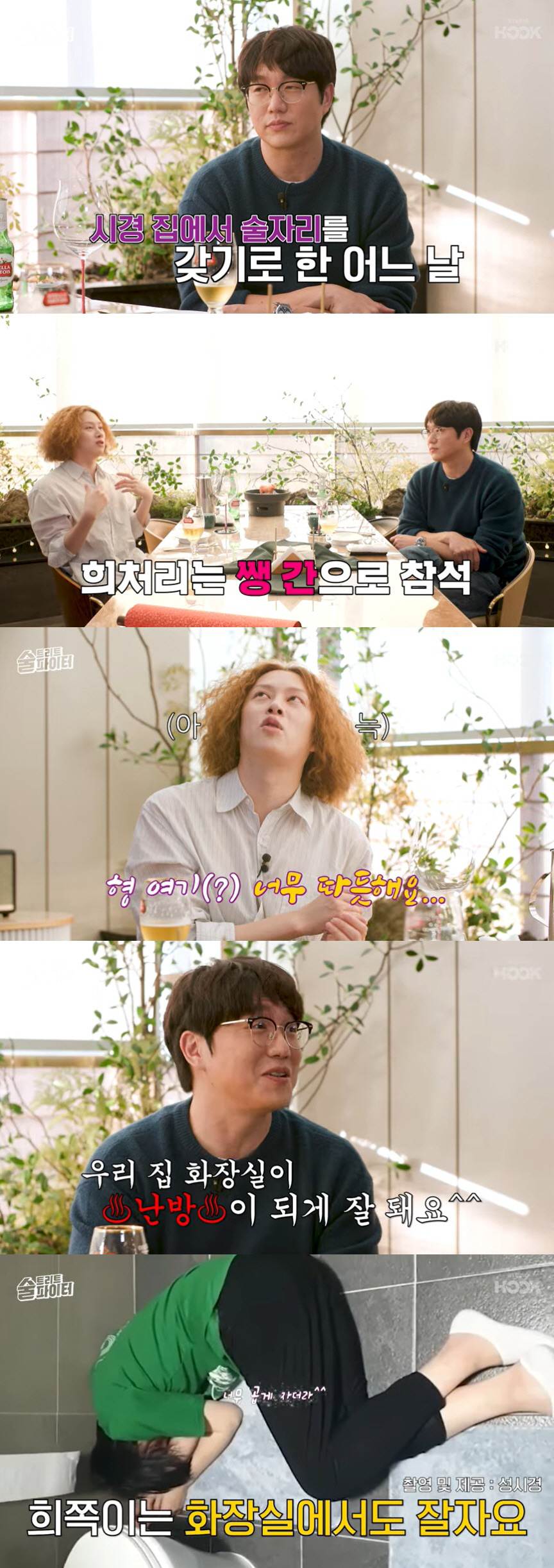 김희철은 "형네 집에서 소주를 마신 적이 있었다. 그때 형이랑 동엽이 형은 프로그램 회식을 하고 오고 나는 그냥 룰루랄라 갔다. 오늘은 시경이 형이랑 끝까지 먹는구나 했는데 동엽이 형 중간에 가시고 어느 순간 형이 날 깨웠다. '여기 너무 따뜻하다' 했다"고 떠올렸다. 이에 성시경은 "우리집 화장실이 되게 따뜻하다. 너무 곱게 자더라"라고 밝혔다. 김희철이 만취해 성시경네 집 화장실에서 잠든 것. 함께 공개된 증거영상 속에는 만취한 김희철이 화장실에서 곱게 누워 자고 있는 모습이 공개돼 웃음을 안겼다.