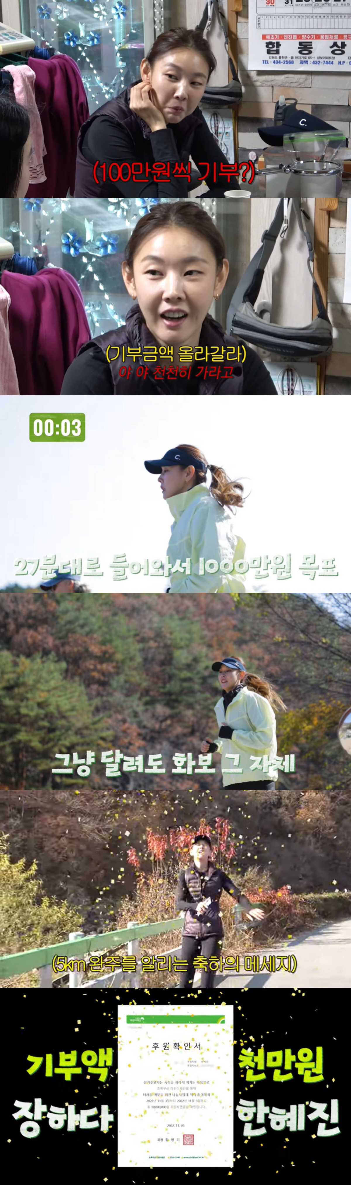 한혜진의 기부 마라톤이 시작됐다. 엄마와 함께 5km 달리기를 시작한 한혜진. 한혜진은 초반부터 스피드를 내 엄마를 가볍게 추월했다. 한혜진은 400m를 남기고 막판 스퍼트를 냈다. 한혜진의 엄마도 꾸준한 속도로 한혜진을 뒤쫓았다. 한혜진의 최종 기록은 7분 단축한 30분 03초. 최고기록을 달성한 한혜진은 "인생 5km를 갱신했다"며 뿌듯해했다. 하지만 10분이 아닌 7분을 단축했기에 기부 금액은 700만 원. 한혜진은 엄마의 기록이 33분이라는 이야기를 듣고 "그럼 내가 엄마보다 빠른 3분, 단축한 7분을 합쳐서 1000만 원을 해야겠다"는 독특한 계산법으로 1000만 원 기부를 하기로 했다. 한혜지는 초록우산재단에 1000만 원을 기부했다.