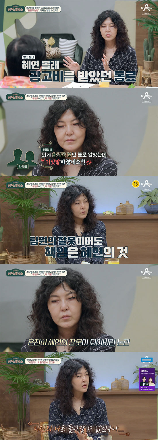 이에 오은영은 "일반 대중들은 '솔직한 사람인 줄 알았는데 거짓말했네' 라고 생각한다"고 하자, 한혜연은 "사실 내가 잘못한 부분이 제일 큰 것은 광고 표기하는 방법을 몰랐던 거다. 그 사건 이후로 많이 정리가 됐다. 나와 문제가 있는 동료는 둘째치고 제 책임이다"라고 자책했다.