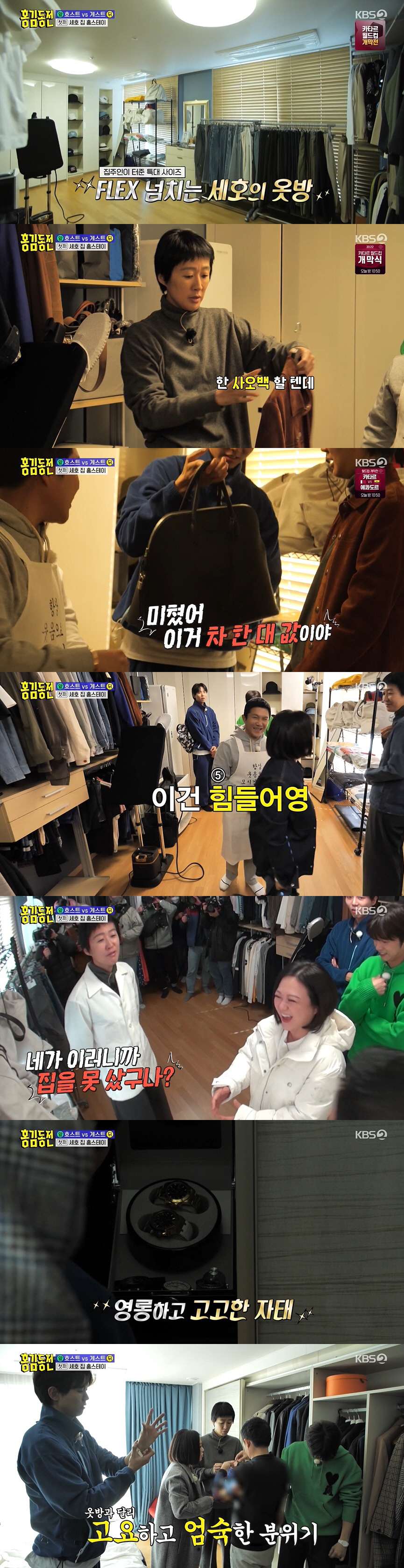 특히 두 개의 방을 터서 만든 특대형 드레스룸에는 각종 유명 브랜드 명품 아이템이 즐비하게 진열되어 멤버들을 놀라게 했다. 드레스룸 곳곳에는 명품 재킷과 가방, 고급 액세서리 등이 포착됐다. 이에 홍진경은 "백화점인 줄 알았다"며 입을 다물지 못했다. 그러면서 "이런 걸 샀냐. 4~500만 원 할 텐데"라며 조세호의 명품 재킷을 착용했다. 또 주우재는 조세호의 명품백을 꺼내 들었고, 홍진경은 "이거 차 한 대 값이다"라며 경악했다.