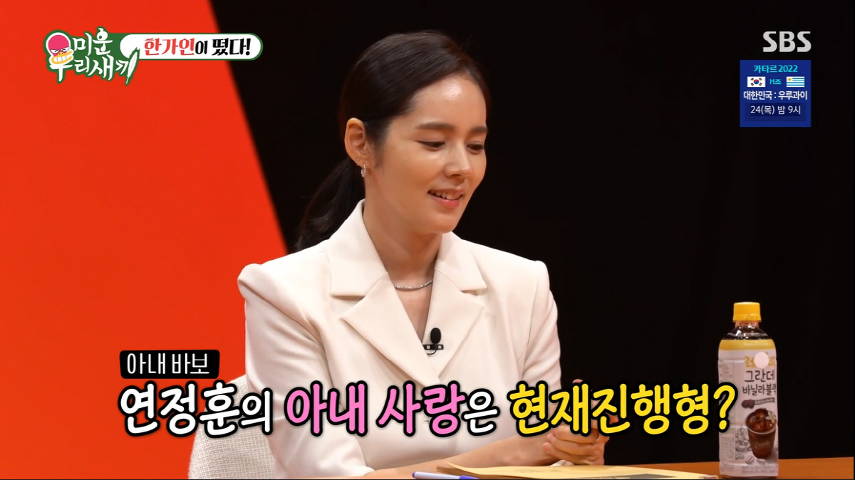 서장훈은 "연정훈이 대한민국 3대 도둑이라는데 연정훈의 아내사랑은 현재진행형이냐"라는 질문에 한가인은 "연정훈이 밖에 나갔다오면 '눈 정화 좀 해야지'라고 한다"라고 말해 모두를 놀라게 만들었다.