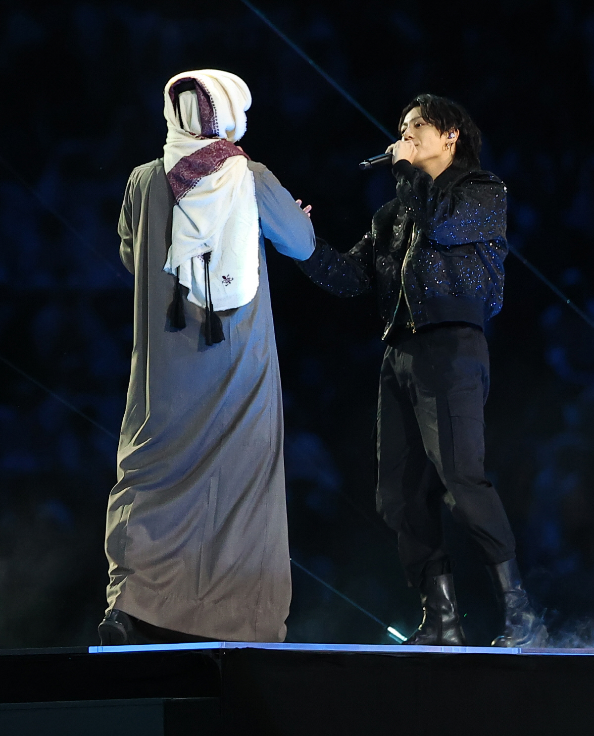 정국은 화려한 퍼포먼스와 완벽한 가창력으로 댄서팀들과 함께 화려한 무대를 꾸몄고, 2절에는 카타르 가수인 파하드 알쿠바이시가 등장해 정국과 함께 노래를 부르면서 분위기가 최고조에 달했다.