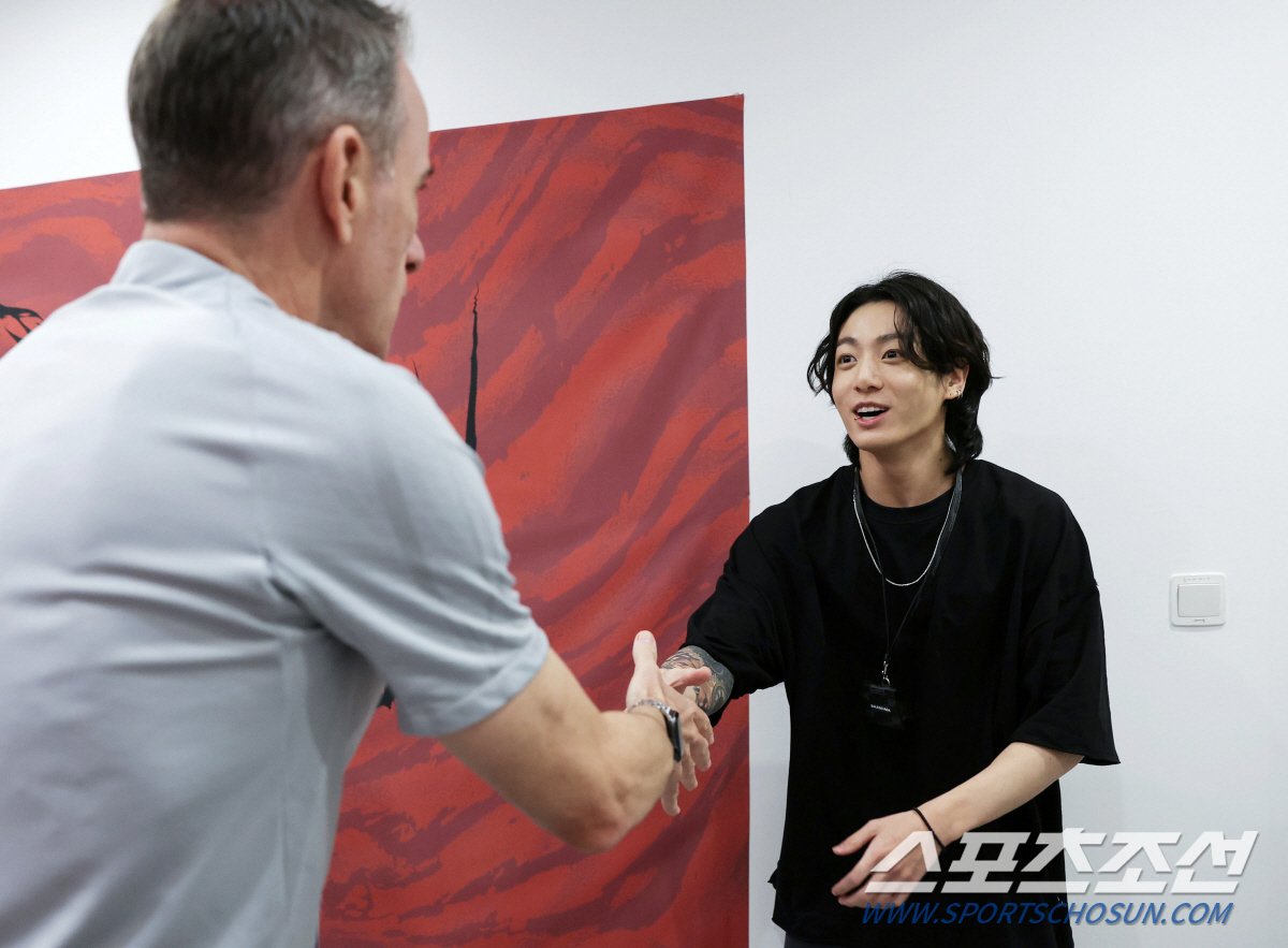 파울루 벤투 감독을 비롯해 손흥민(토트넘) 등 선수들과 반갑게 인사를 나눈 그는 드레싱룸에서 대표팀의 붉은 유니폼을 들고 밝은 표정으로 선수들과 단체 사진을 찍었다. 정국의 옆에는 손흥민이 자리했다.