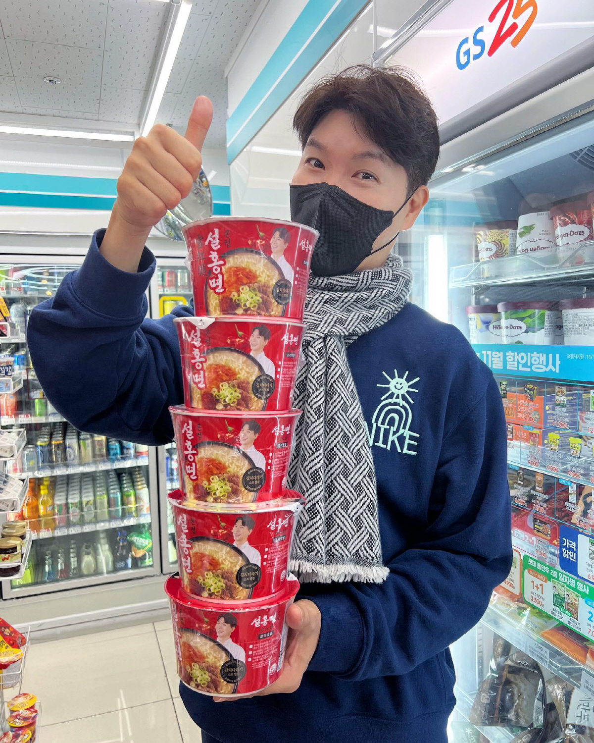 '편스토랑' 첫 출연에 '얼큰 설렁탕 라면'으로 컵라면 부문 우승을 차지한 박수홍은 자신이 개발한 라면이 출시되자 직접 편의점을 찾아 구입까지 한 모습. 박수홍은 자신의 얼굴이 새겨진 컵라면을 들고 '엄지 척' 포즈를 취하며 행복감을 드러냈다.